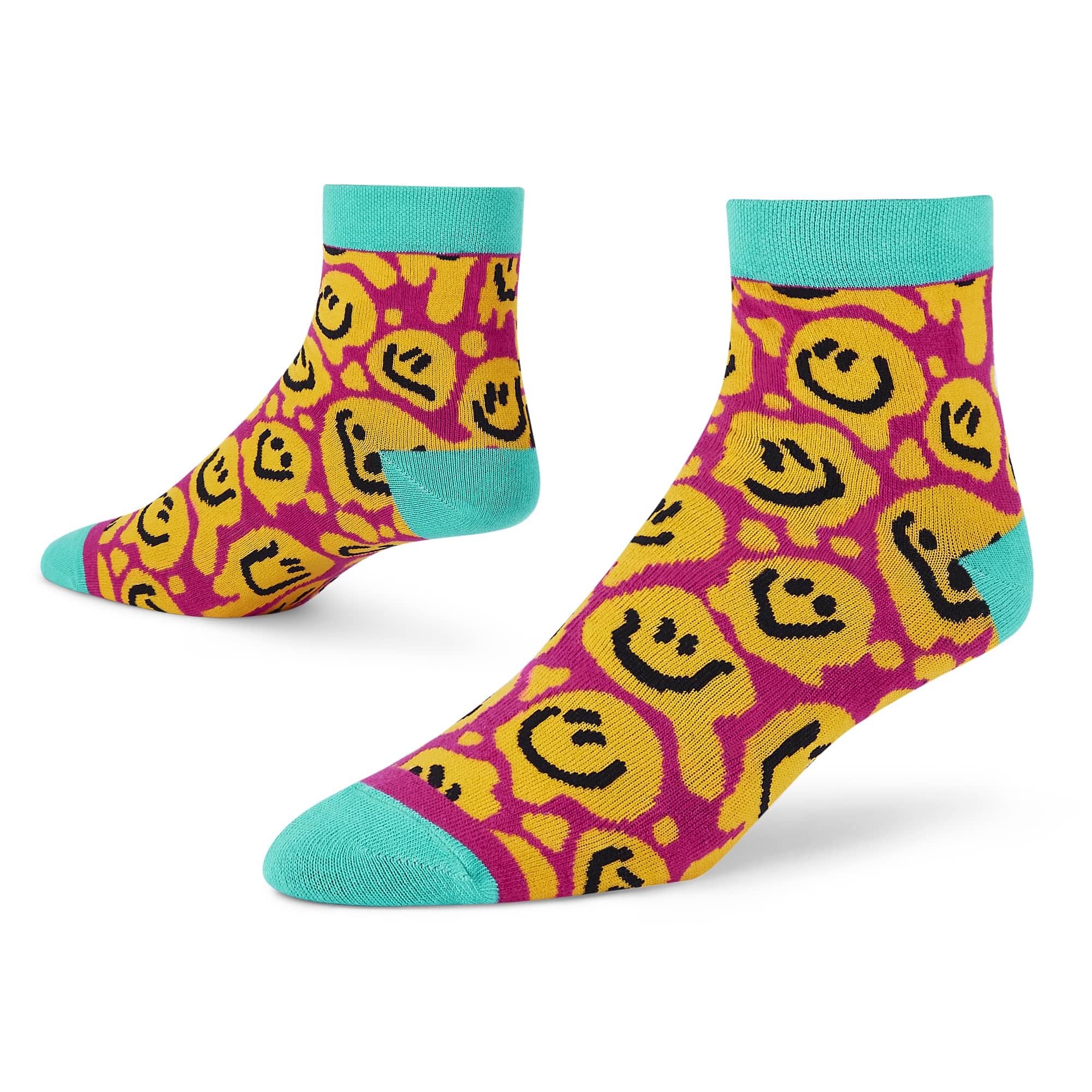 Turn every step into a mood boost with Smiley – a joy-packed design bursting with dripping smiley faces in bright yellow and pink. Paired with aqua-blue cuffs, heels, and toes, this pair is unapologetically playful and full of retro rave energy.